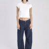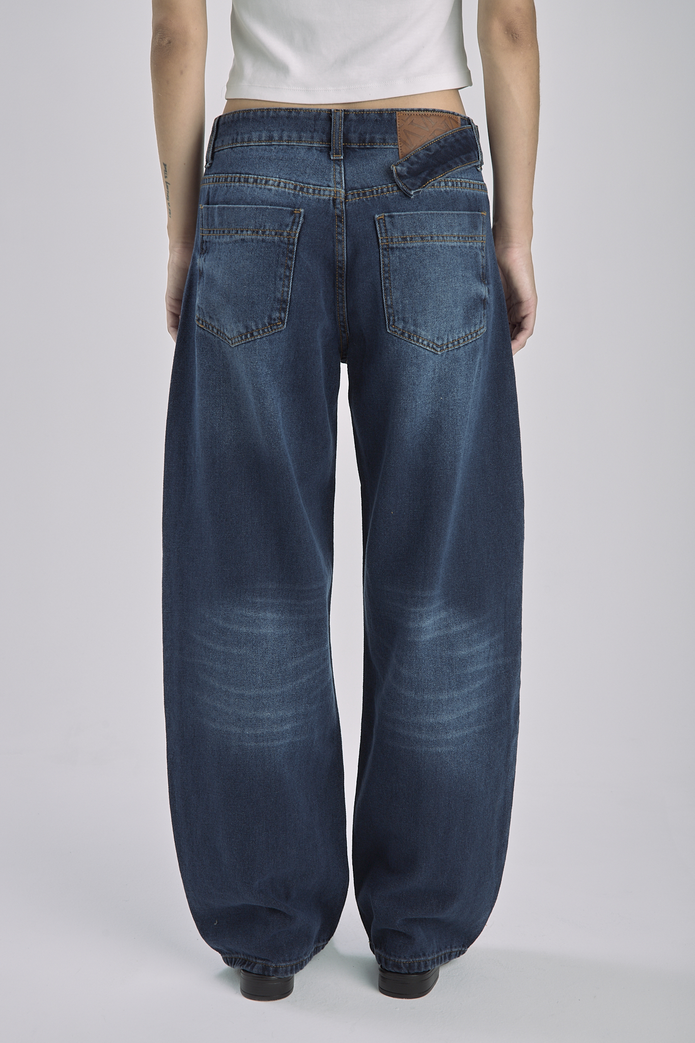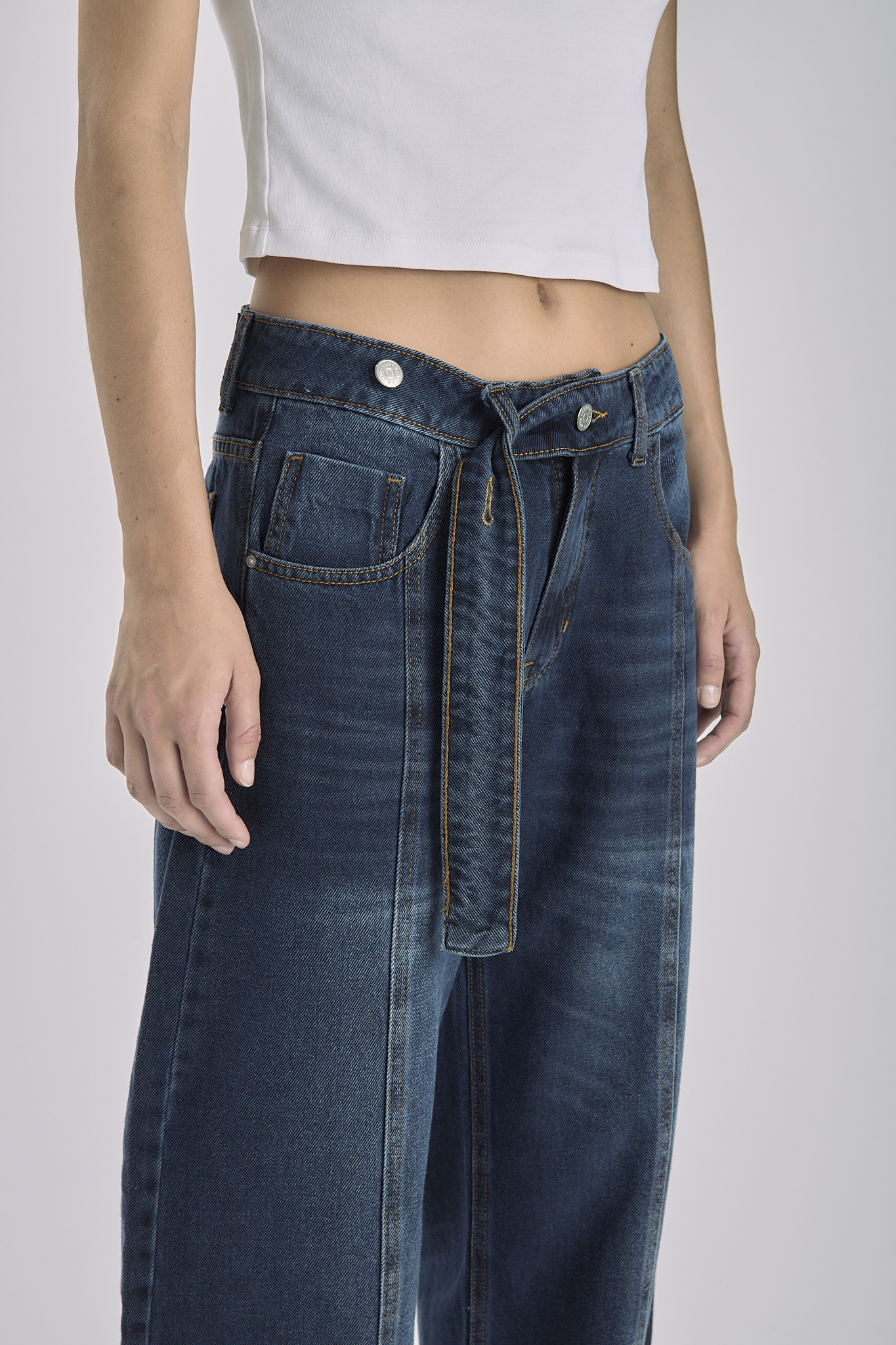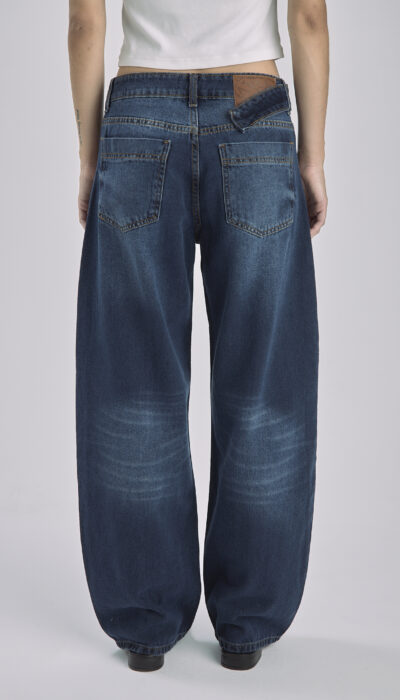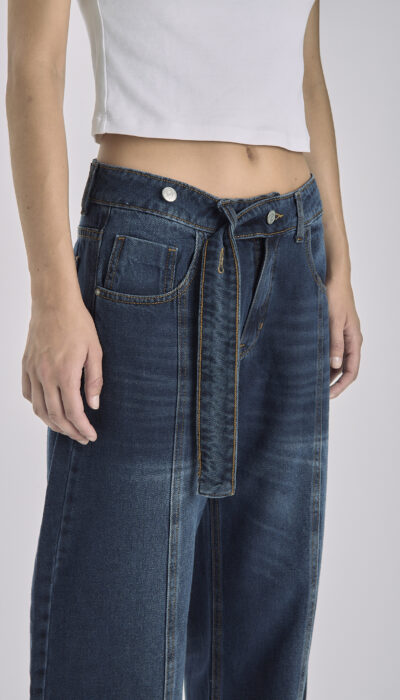 Pantalón Jean Azul Con Recorte Y Cinto Balloon Rígido Tiro Medio