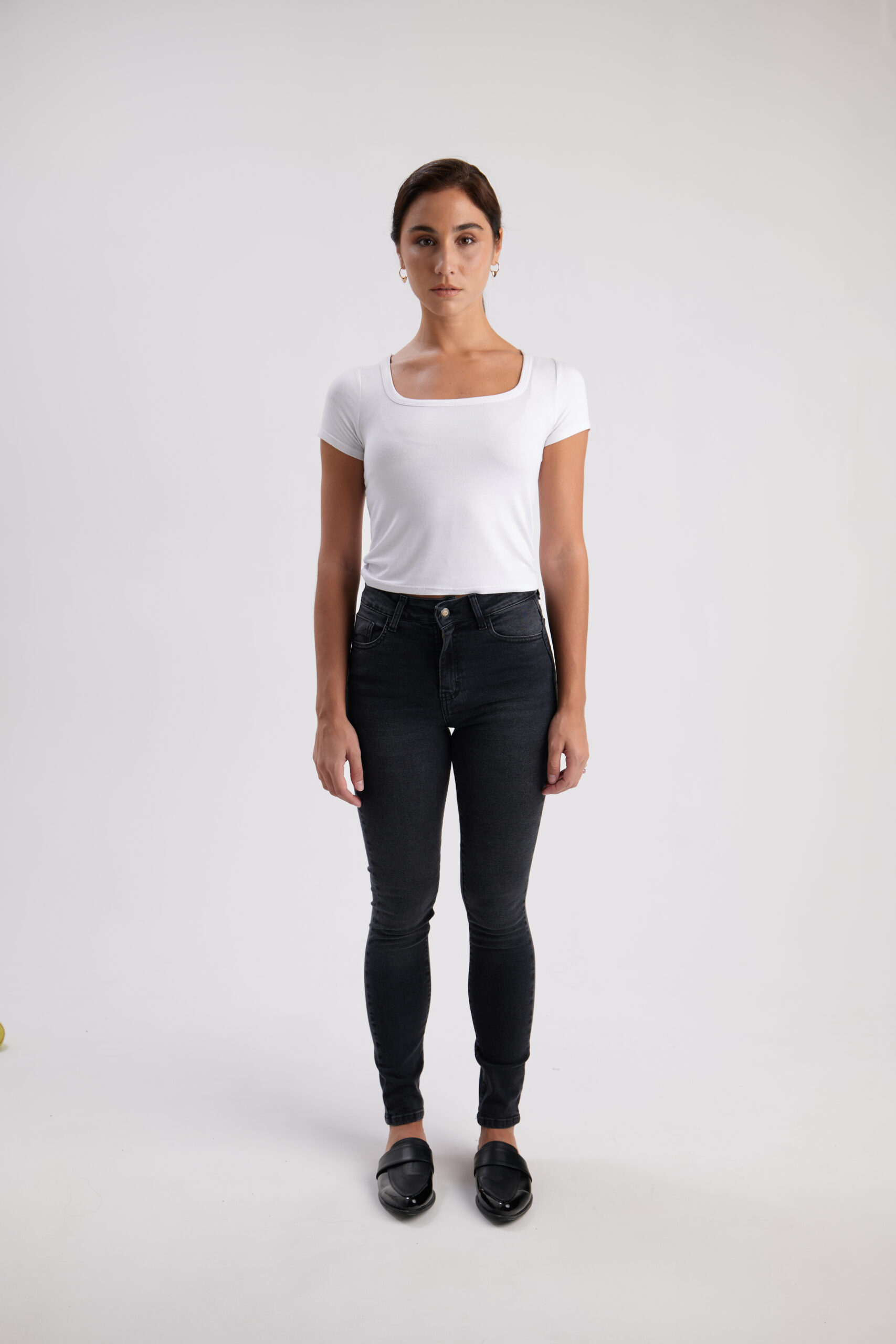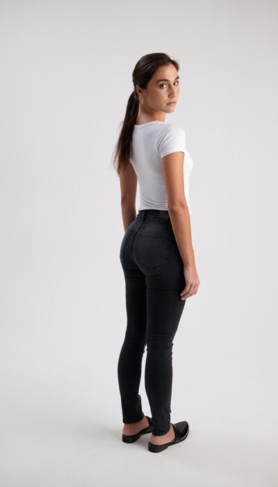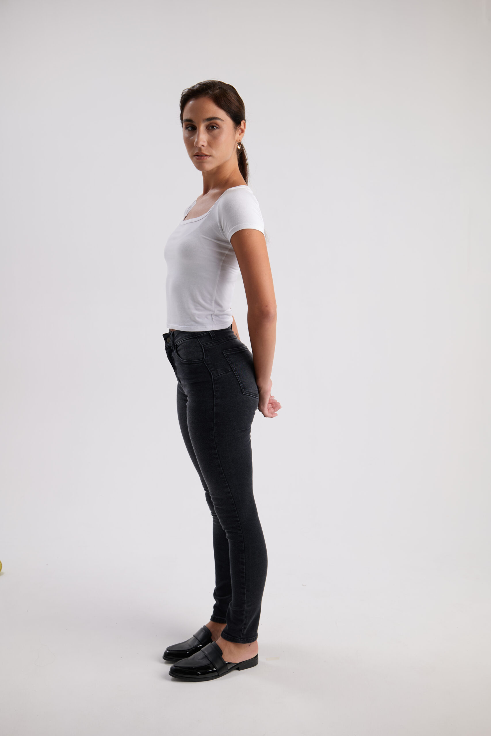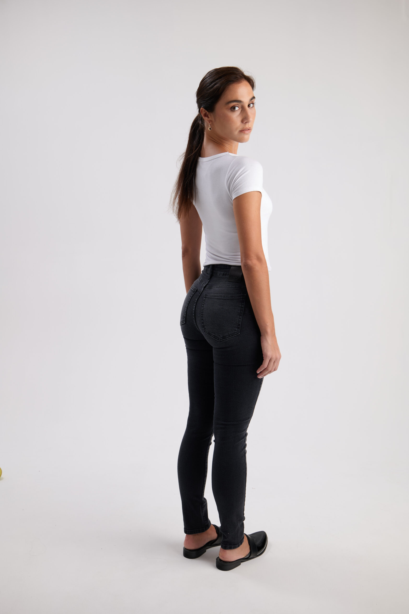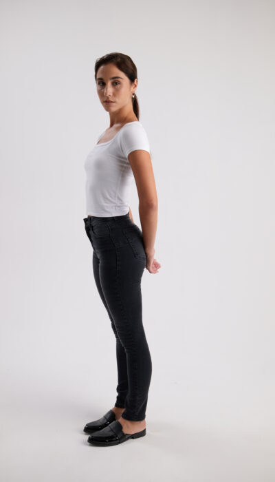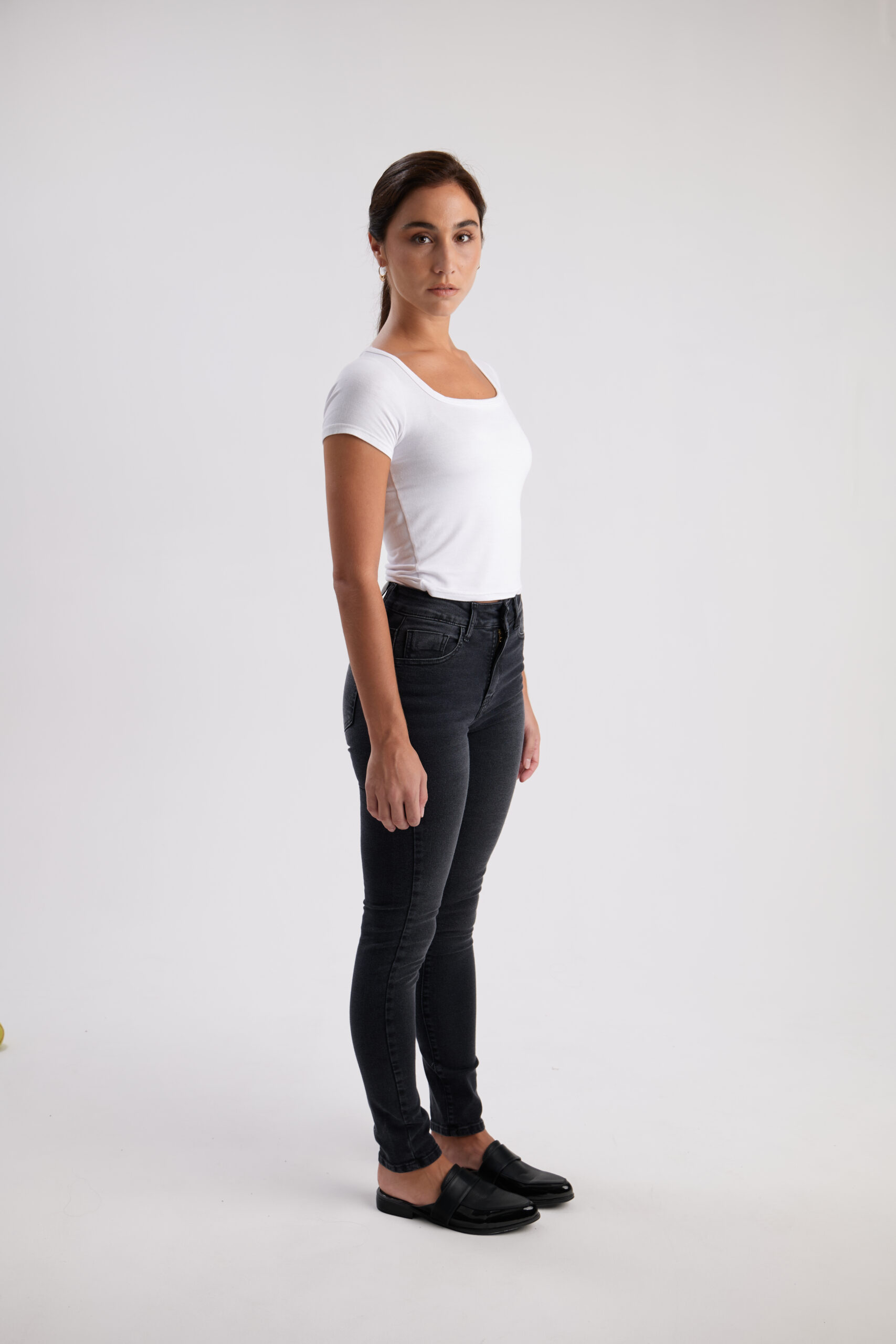 Pantalón Jean Chupin Negro Gastado Pinza Trasera Lateral Elastizado Tiro Medio