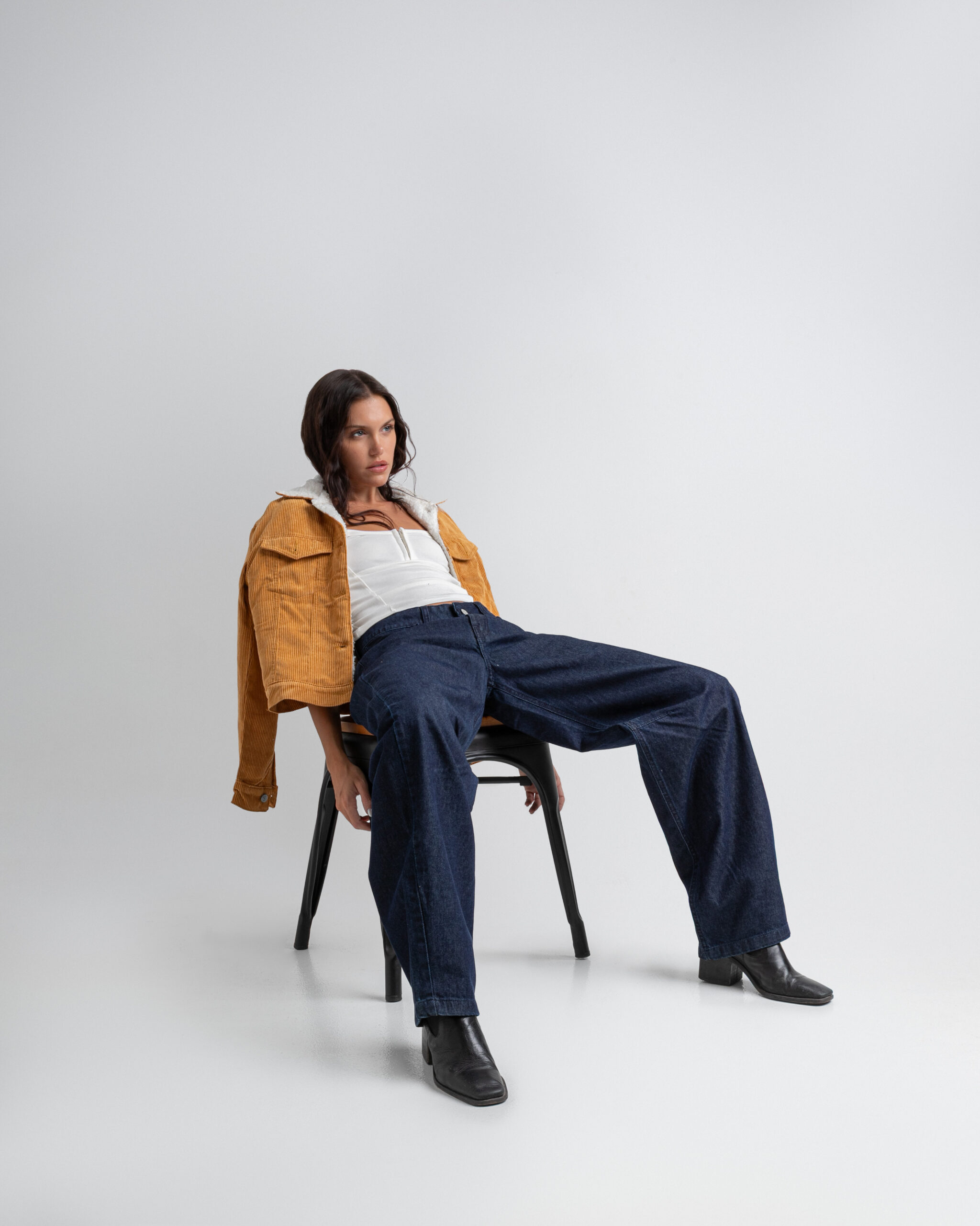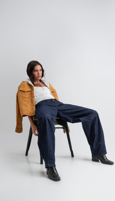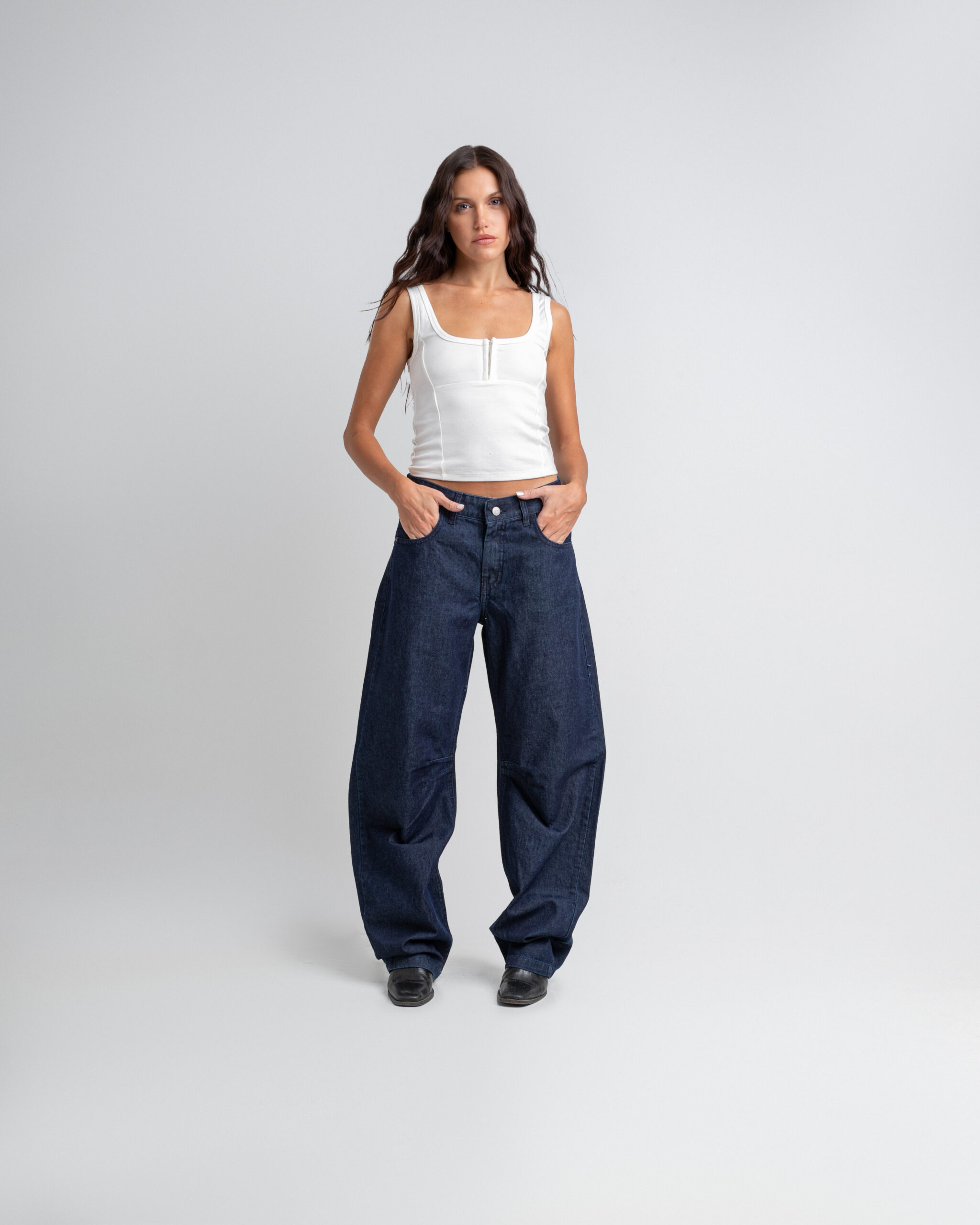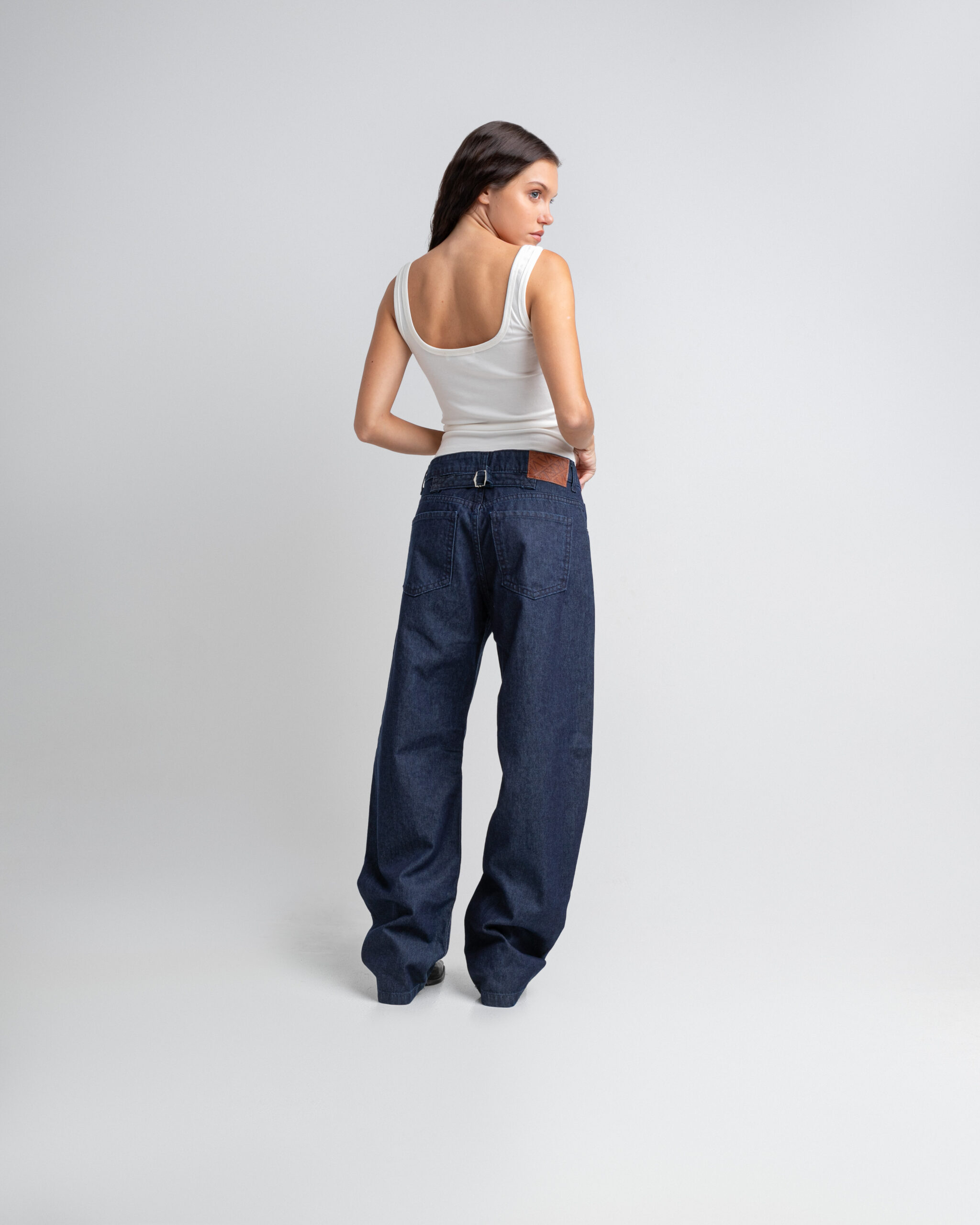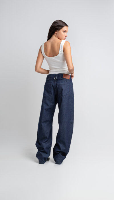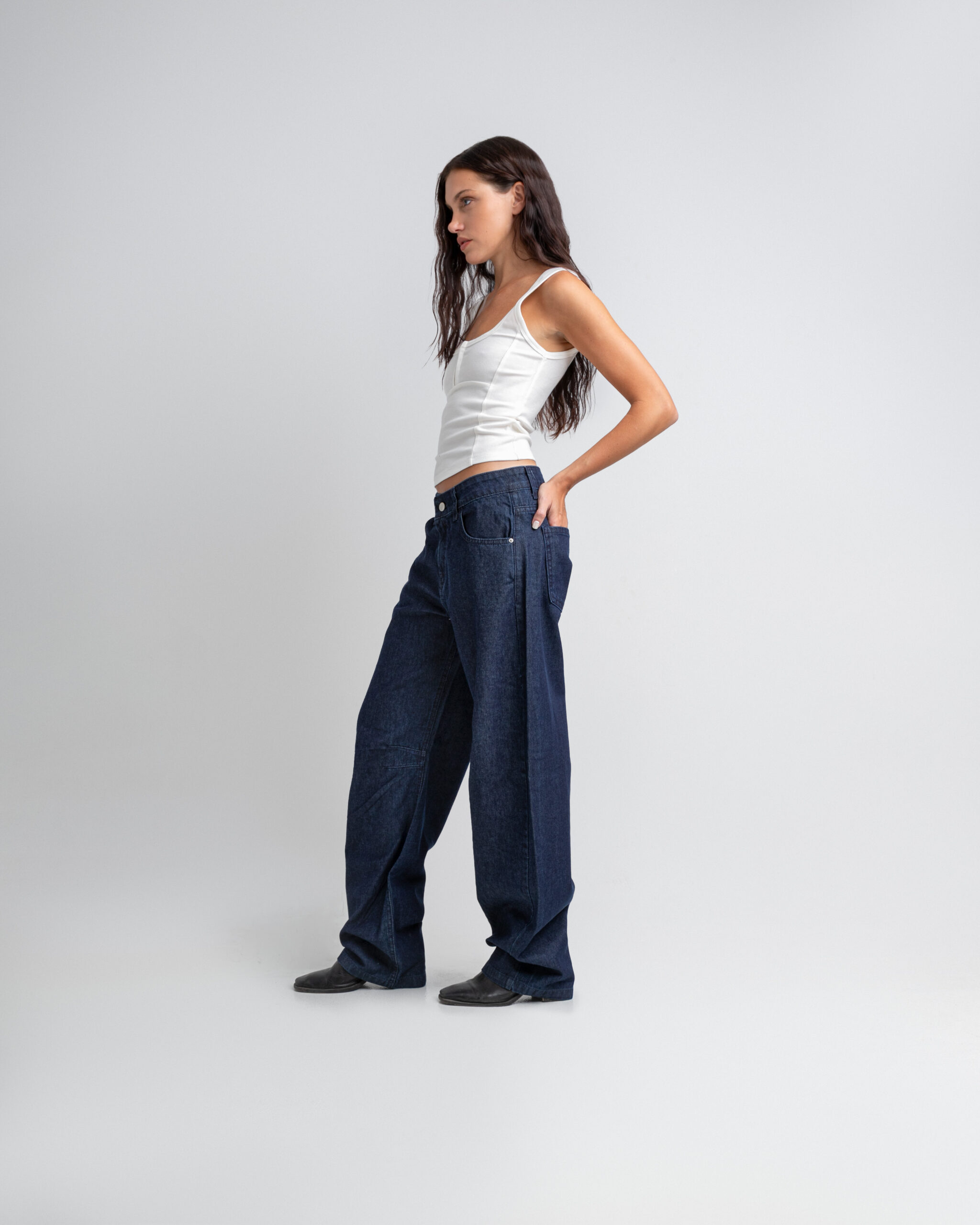 Pantalón Jean Azul Raw Con Pinza Rodilla Y Canesú Trasero Rígido