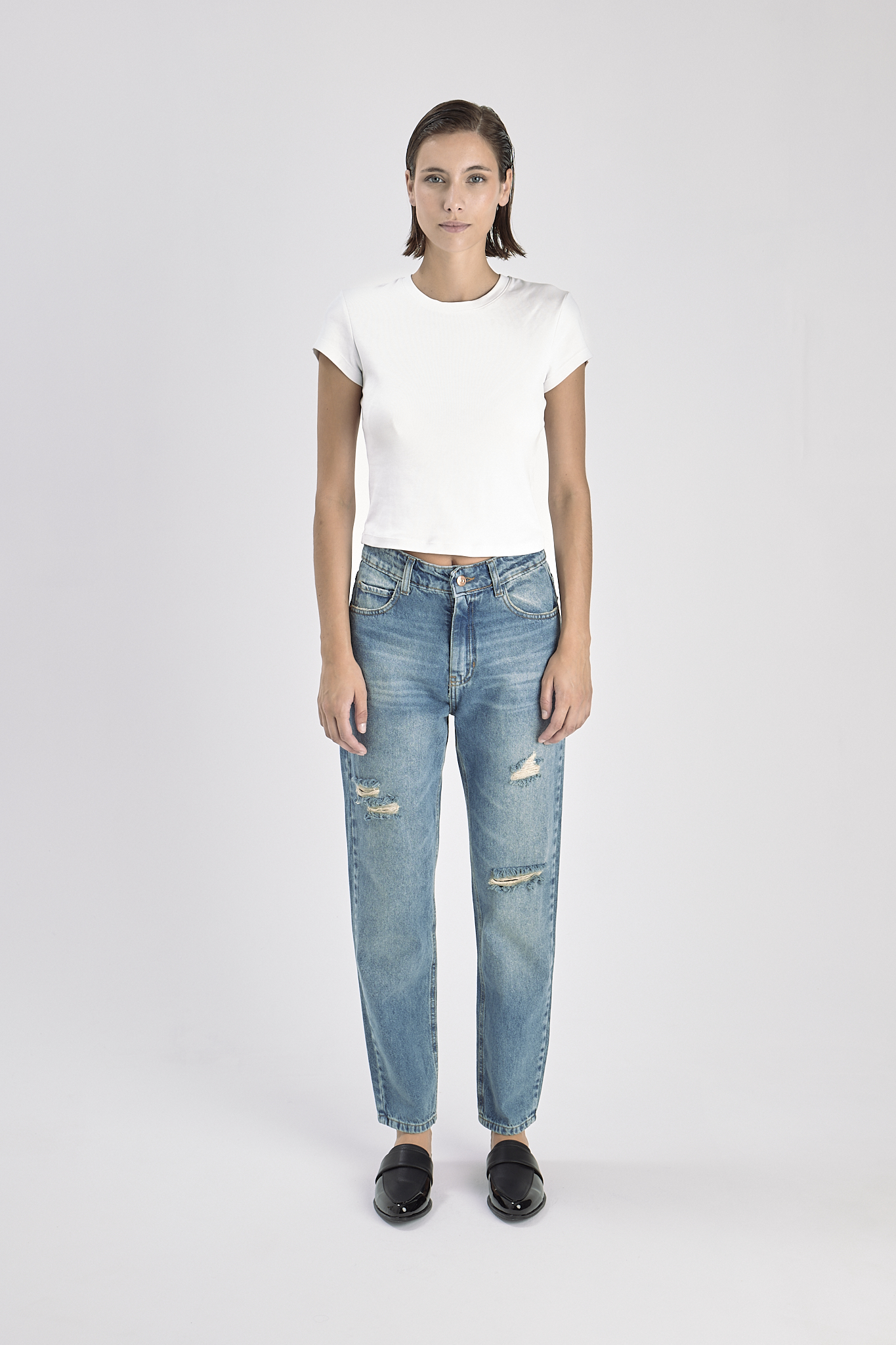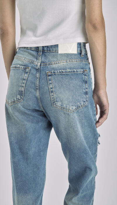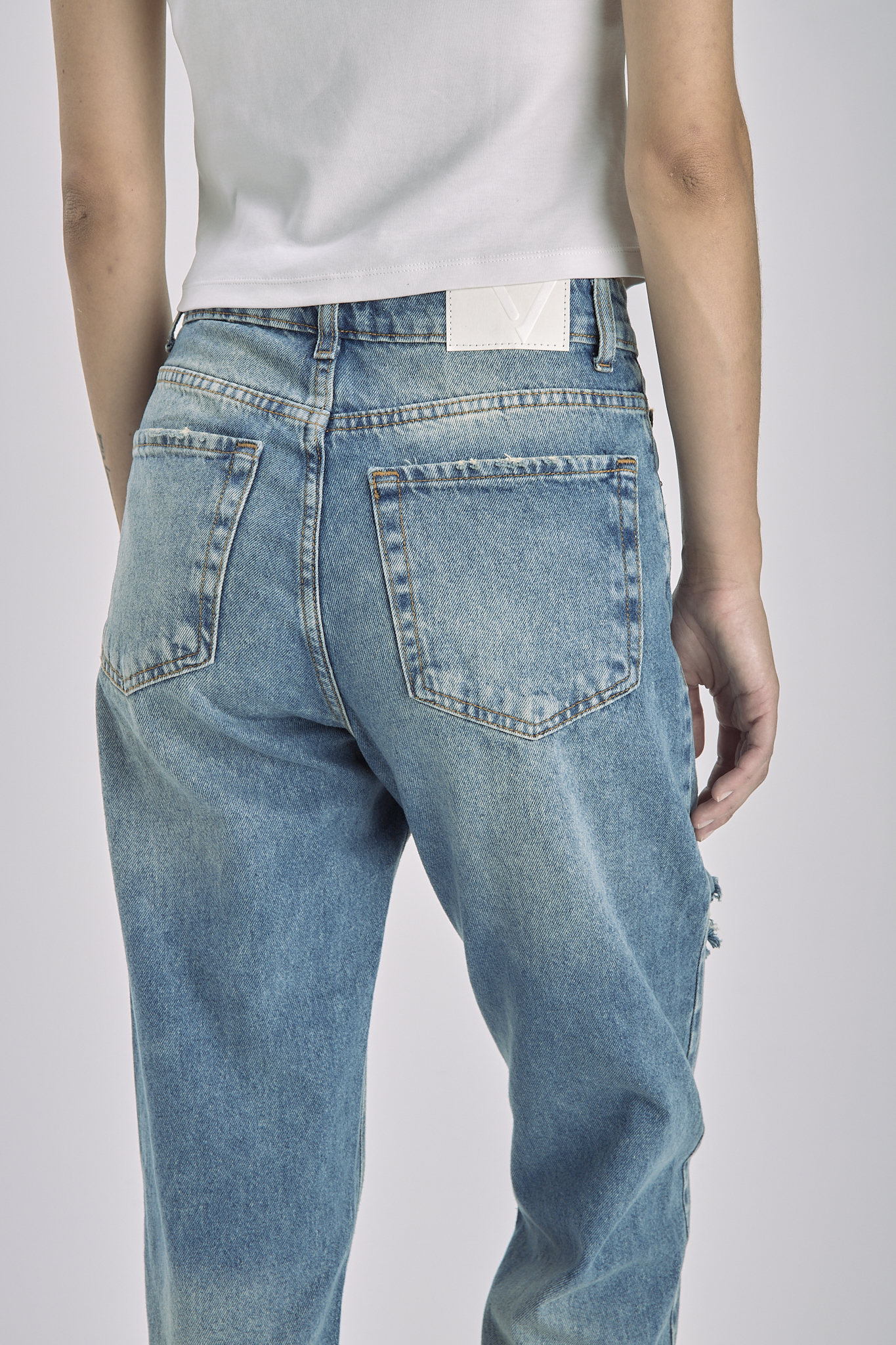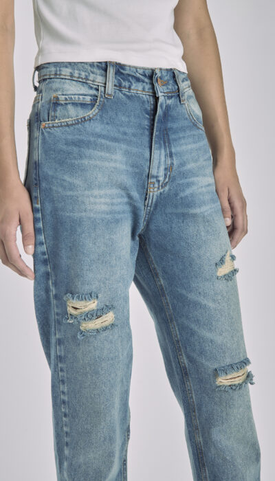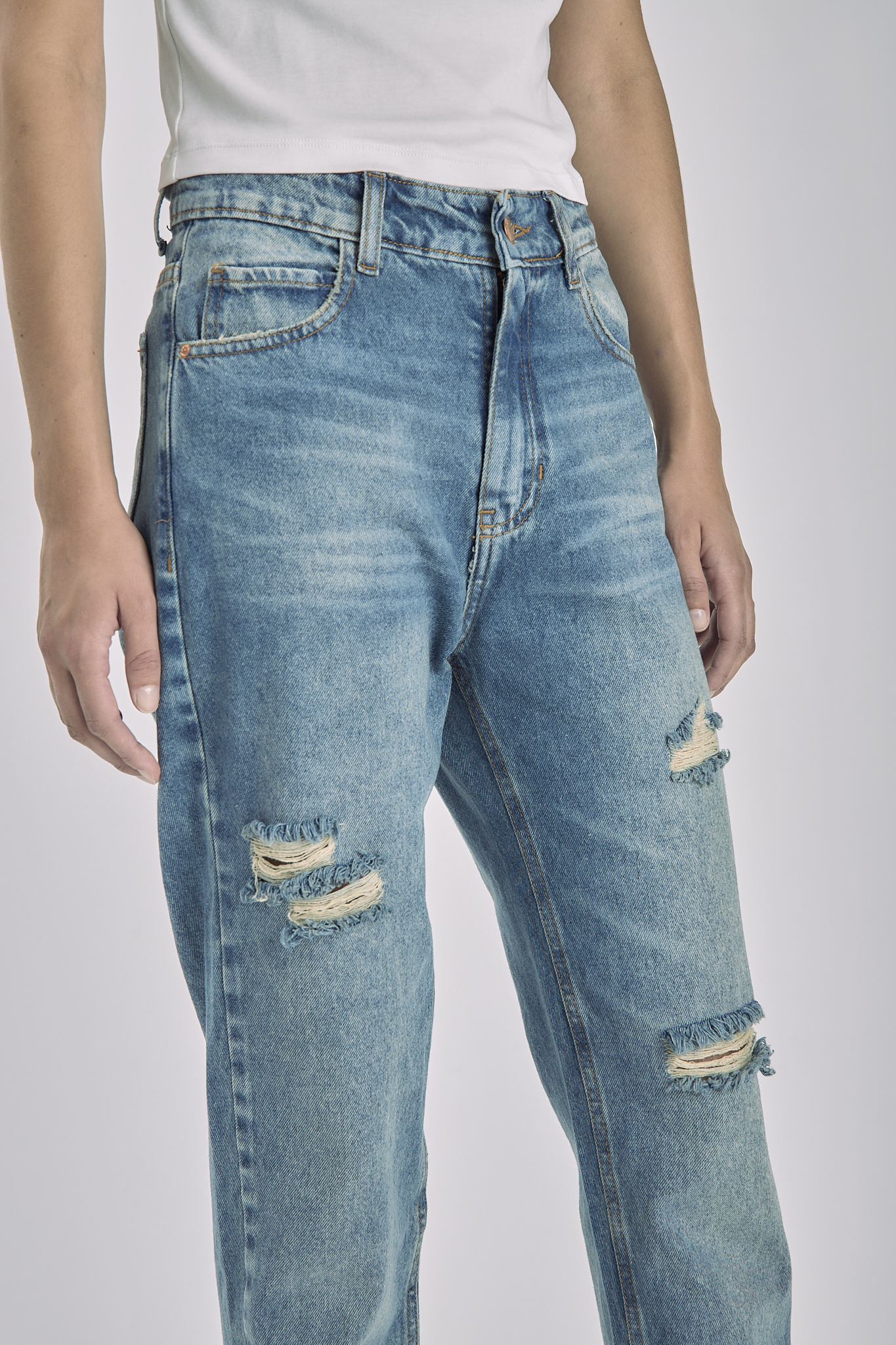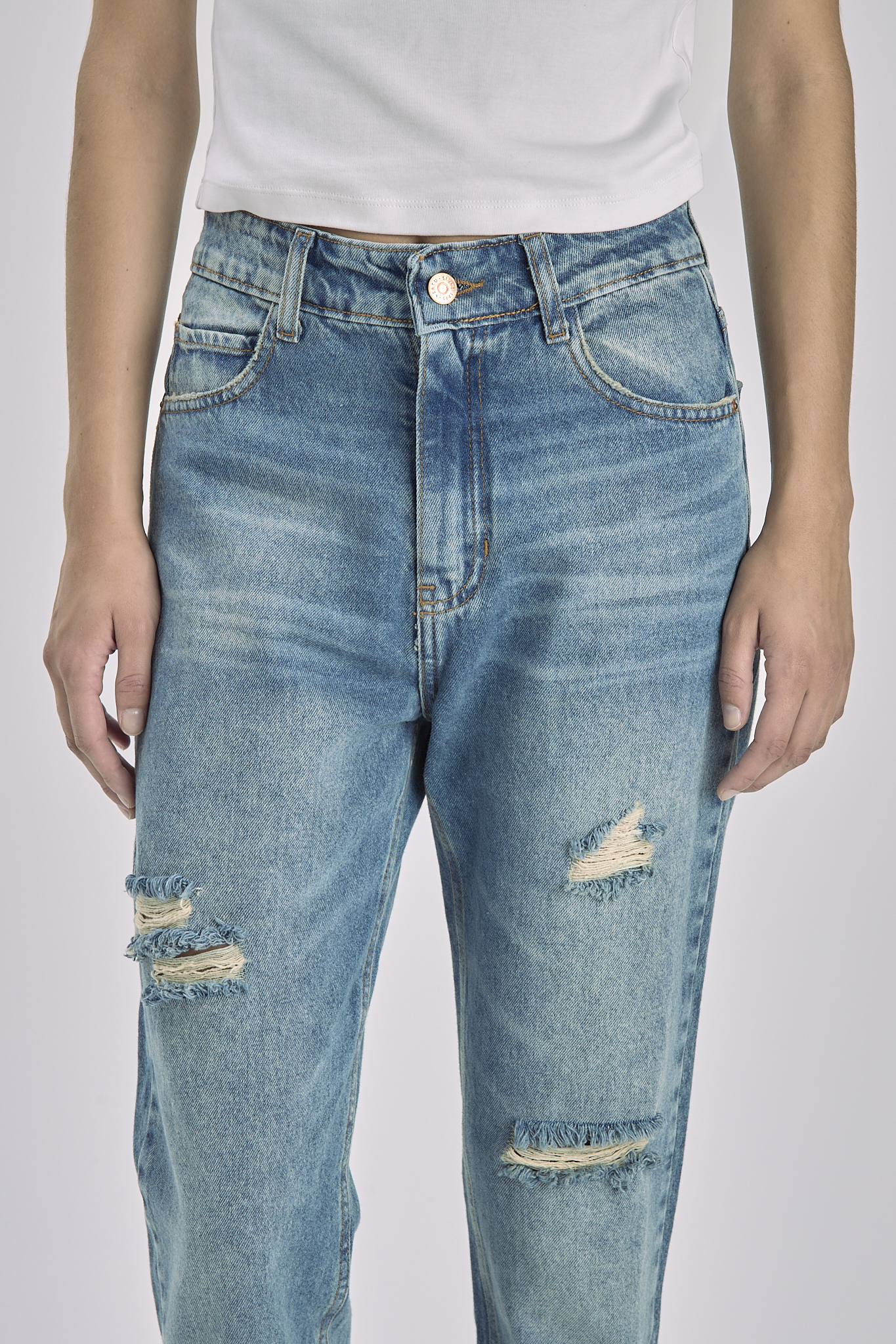 Pantalón Jean Azul Localizado Con Bigote Y Roturas Momfit Rígido Tiro Medido
