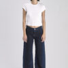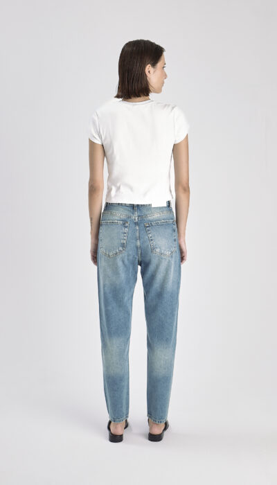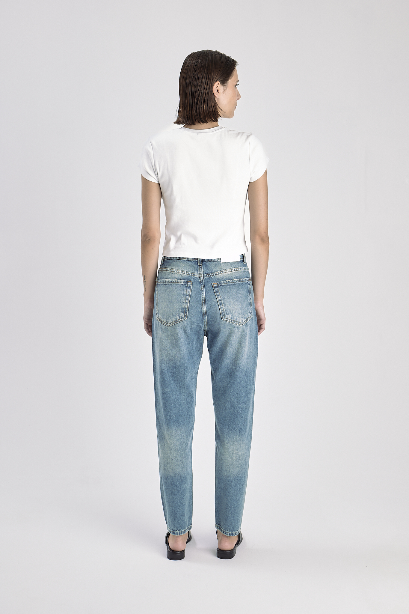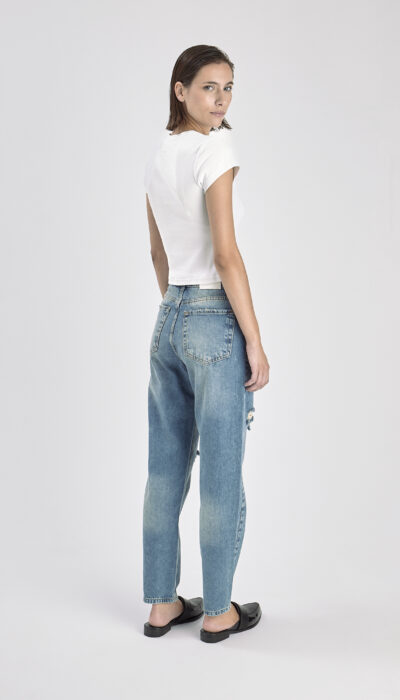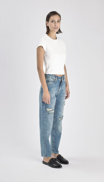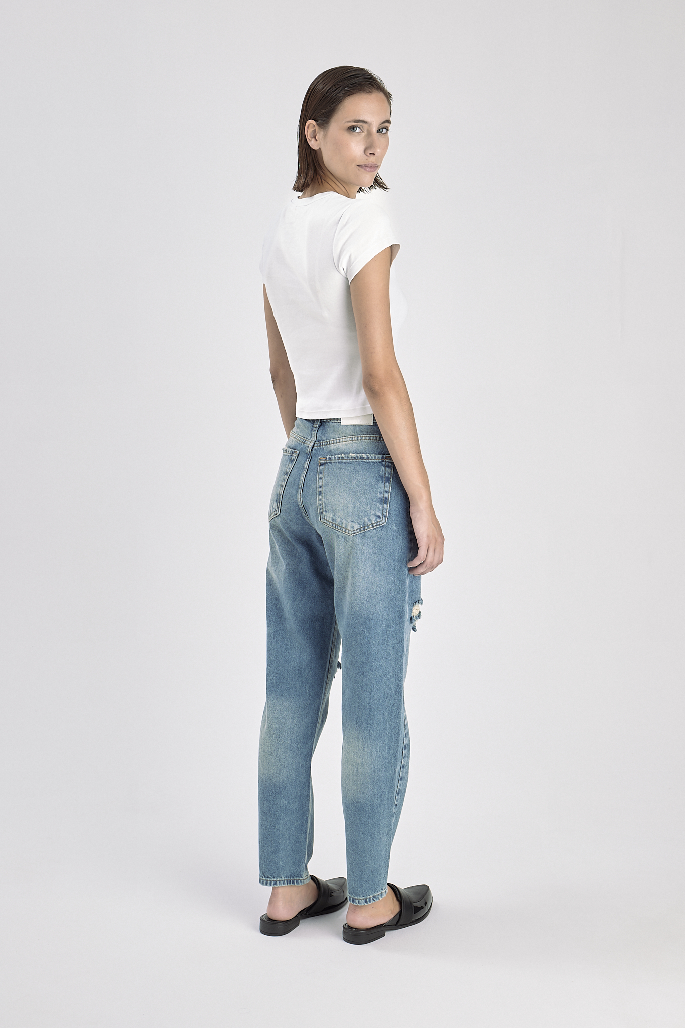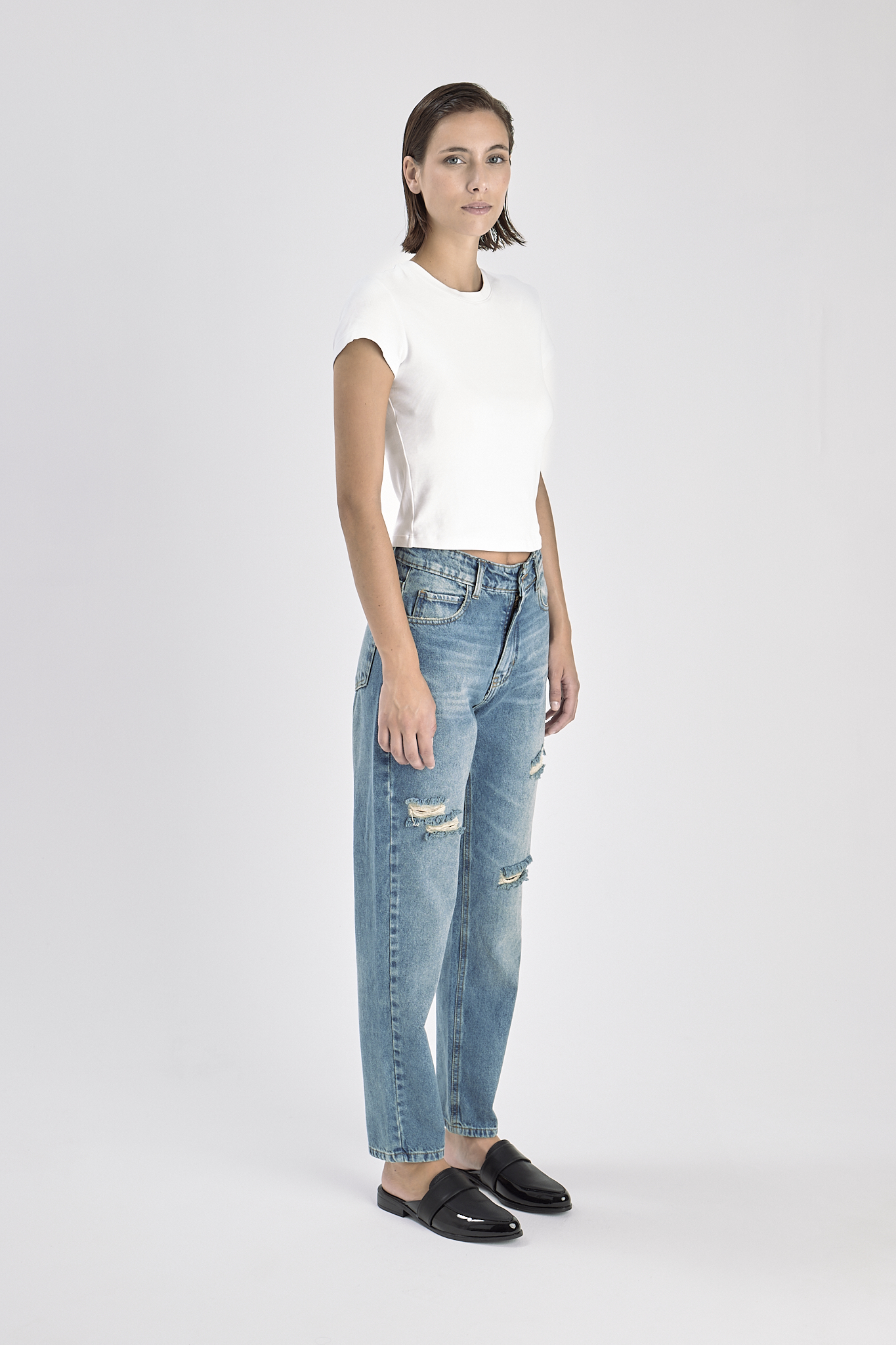 Pantalón Jean Azul Localizado Con Bigote Y Roturas Momfit Rígido Tiro Medido