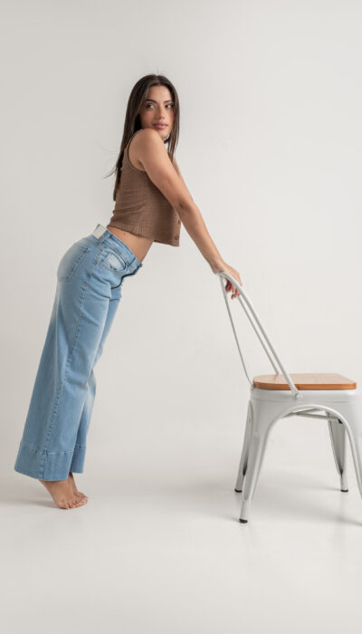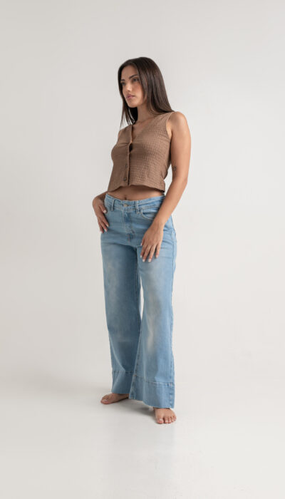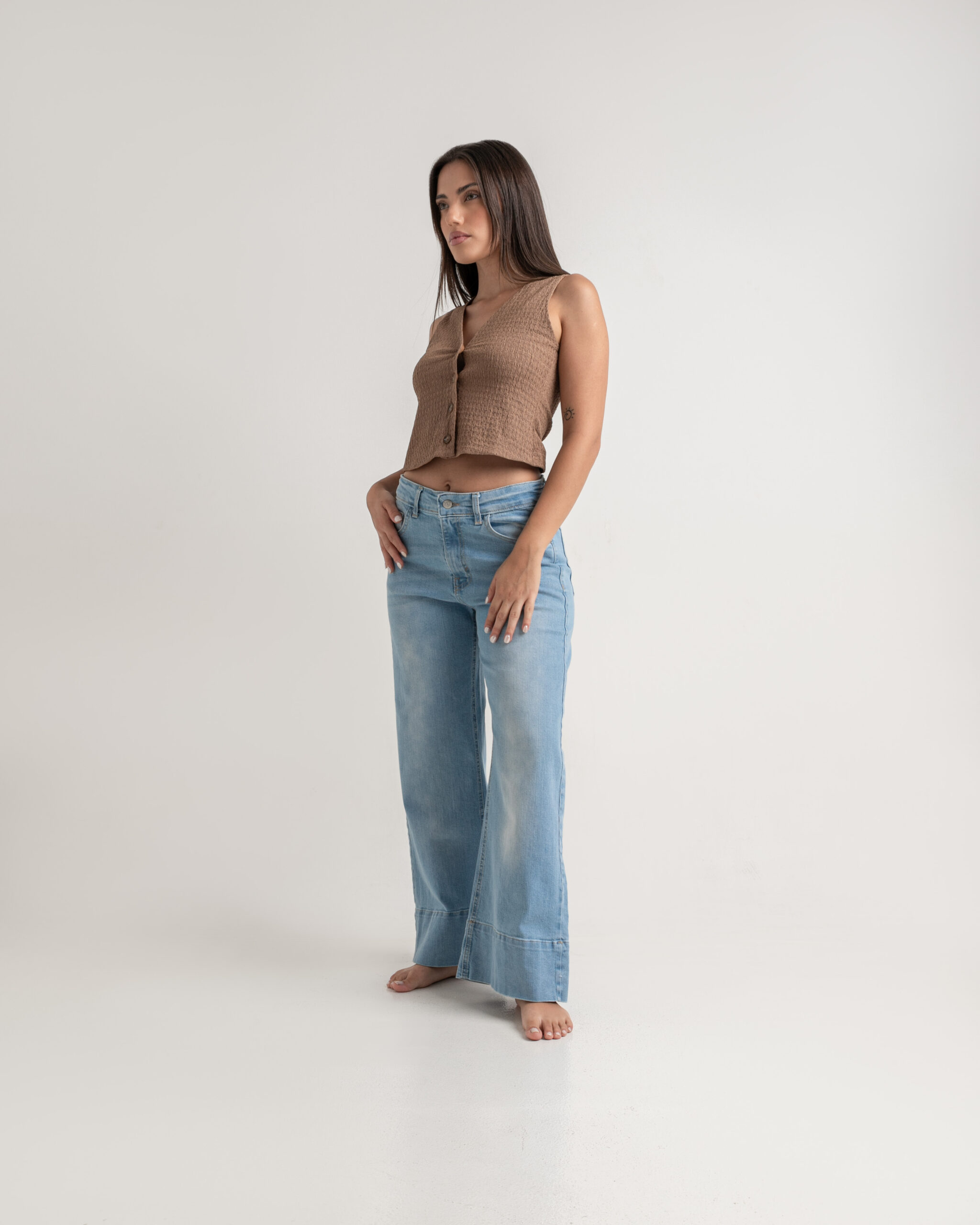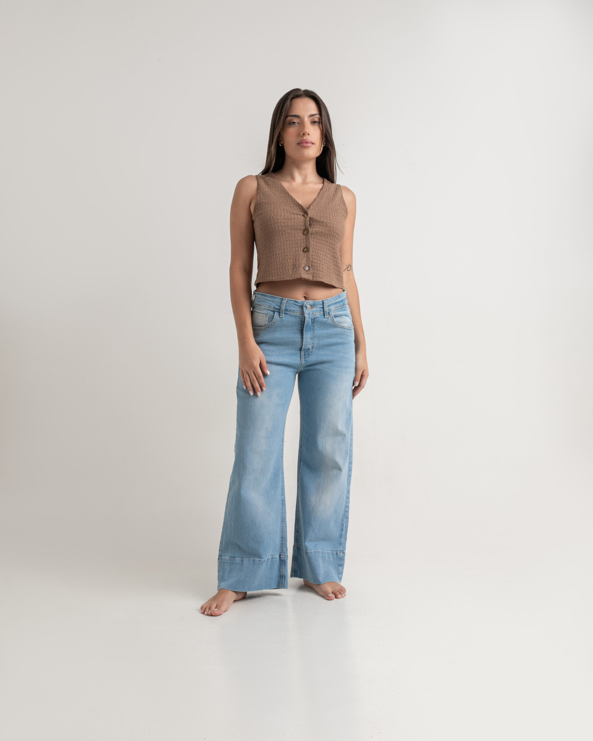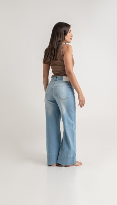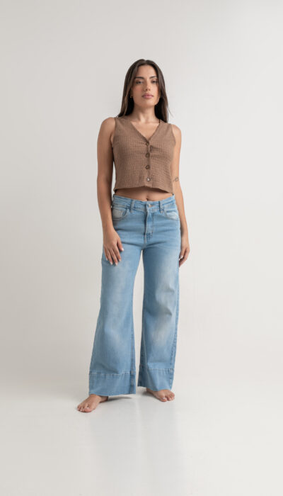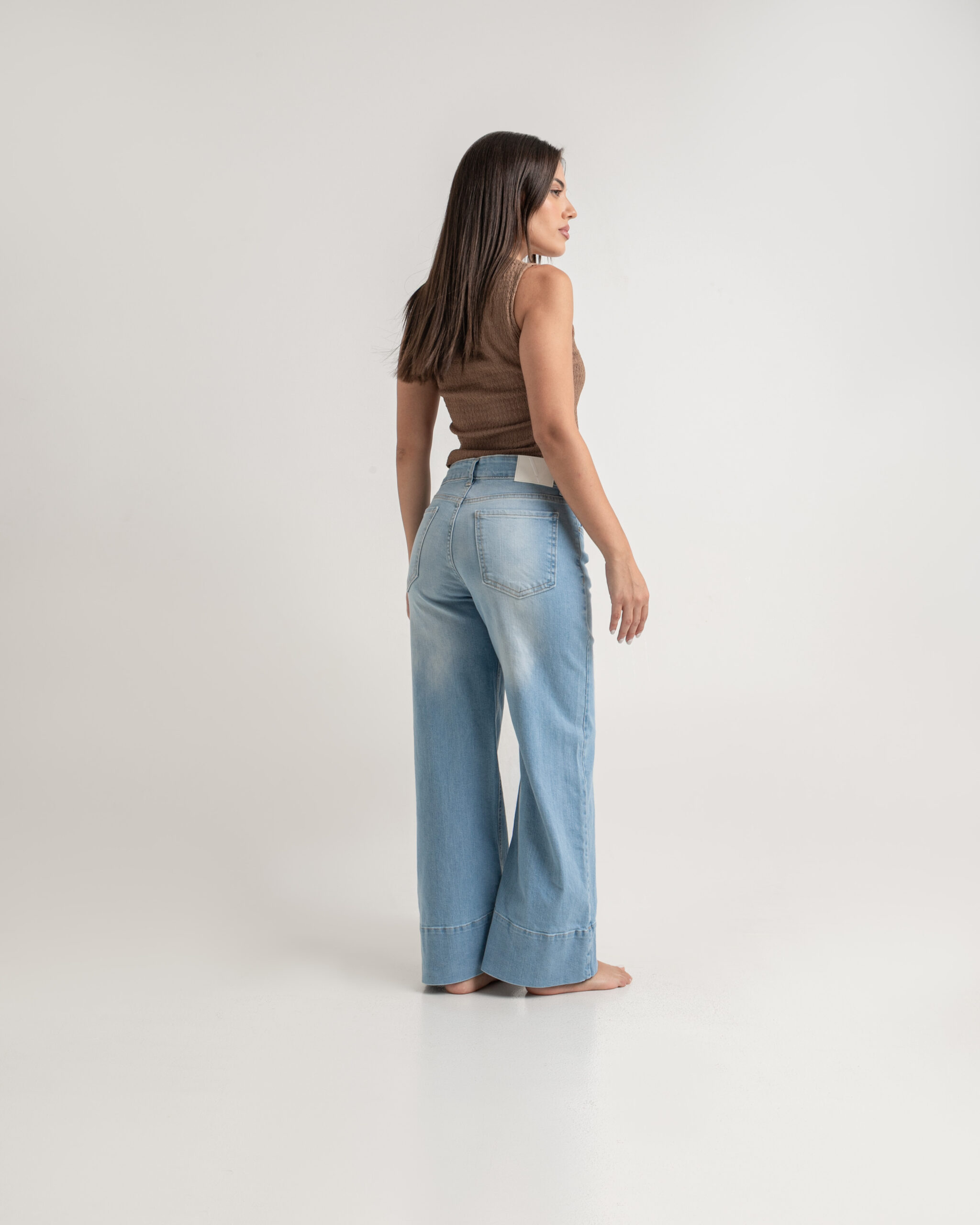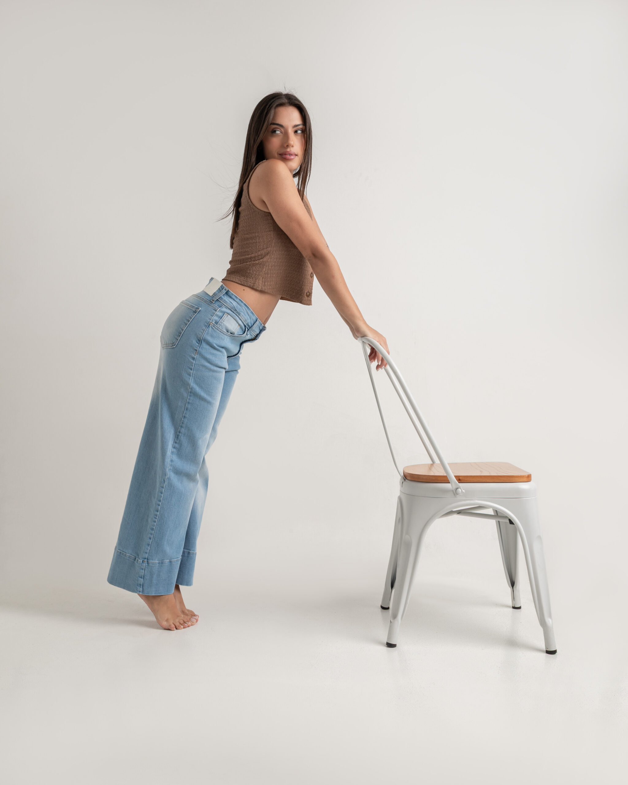 Pantalón Jean Celeste Crooped Ruedo Ancho Wide Leg Elastizado
