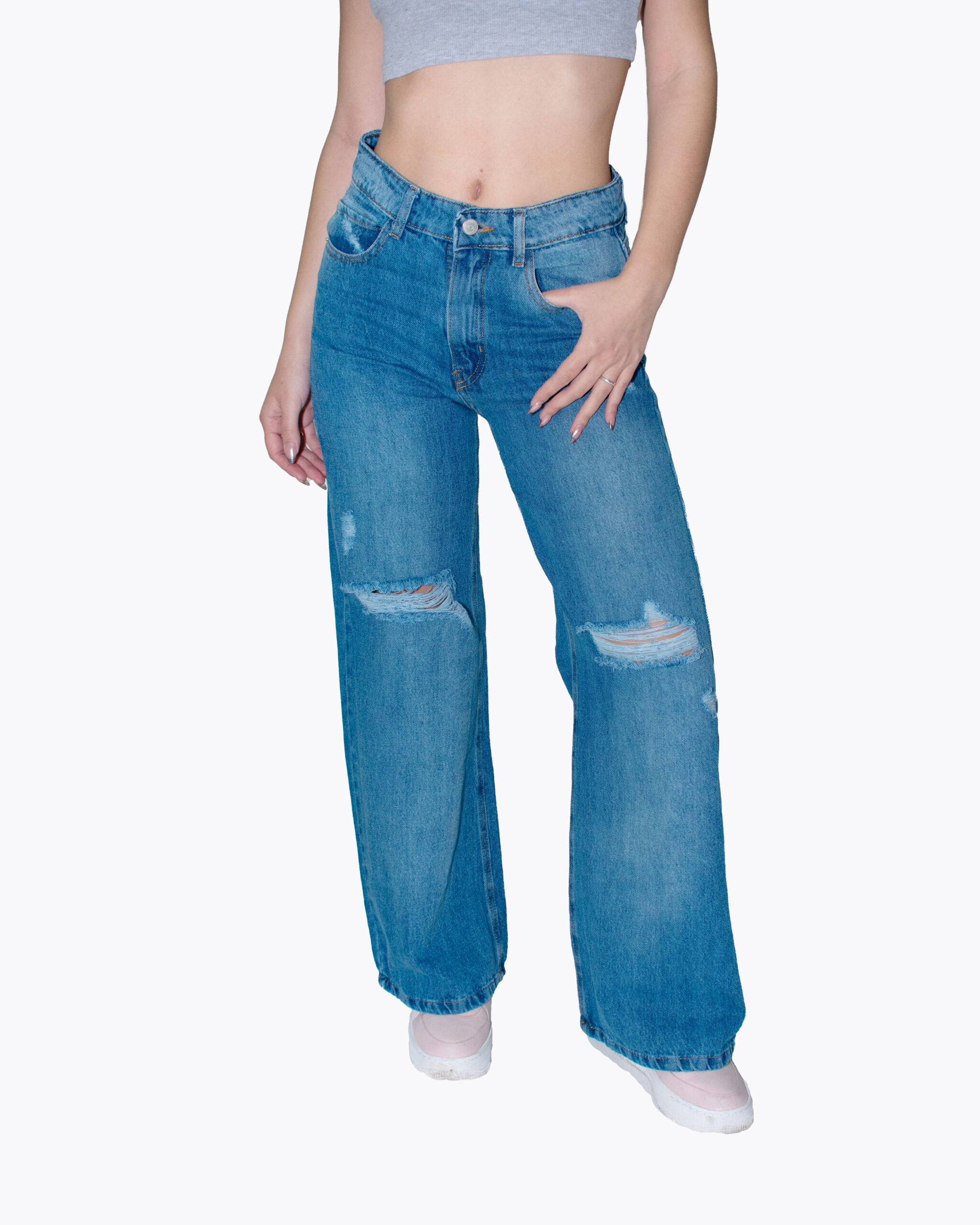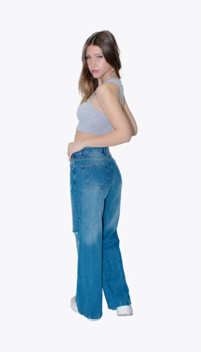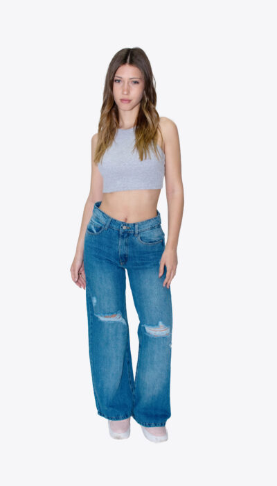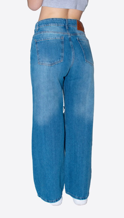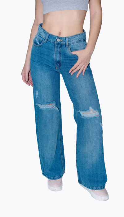 Jean Azul Wide Localizado Con Roturas Rodilla Rigido