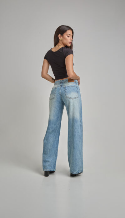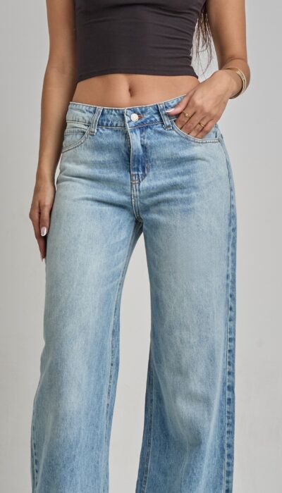 Pantalón Jean Celeste Localizado Con Bigote Wide Leg Rígido