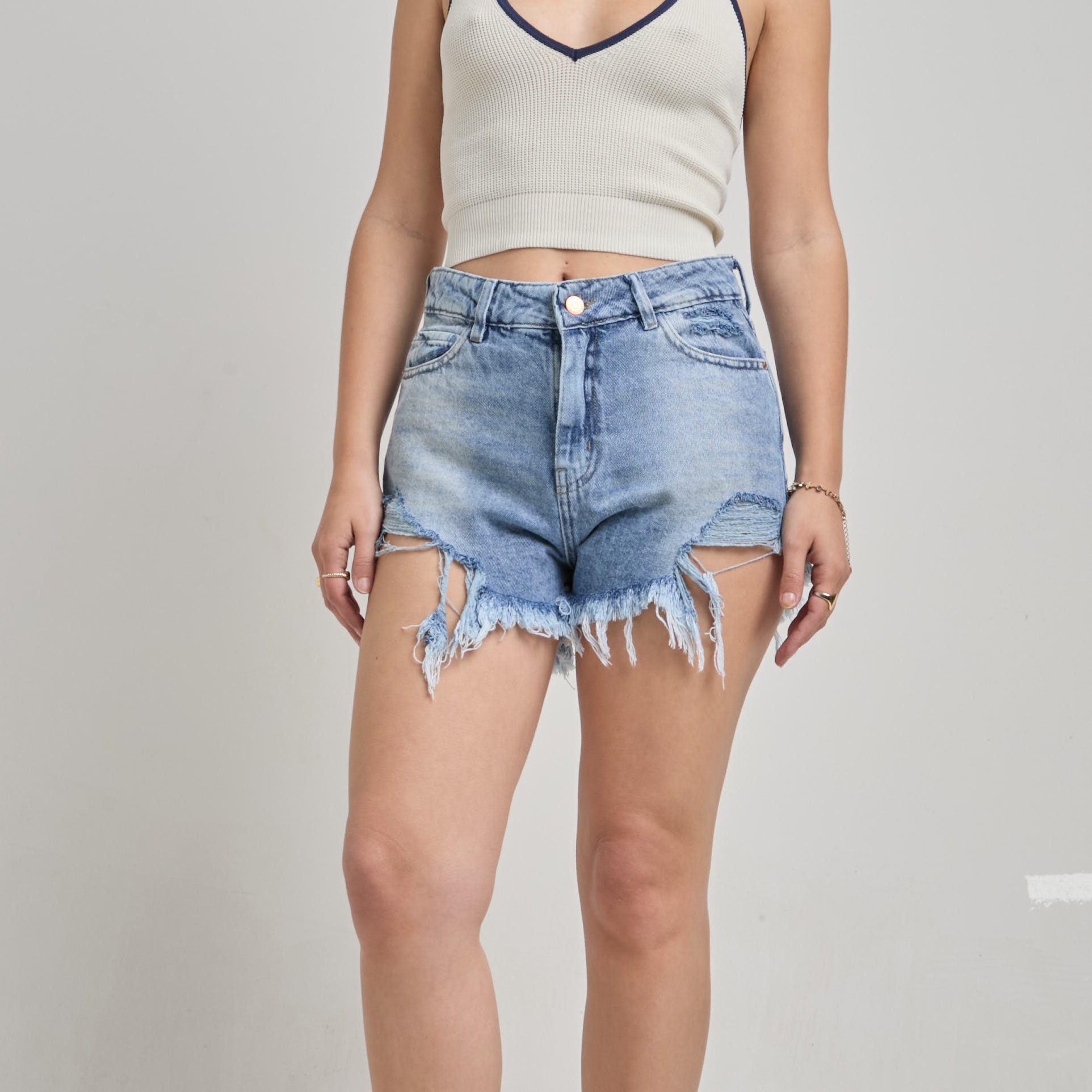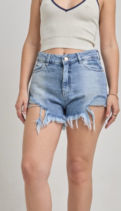 Short Jean Celeste Con Roturas Y Ruedo Deflecado Rígido