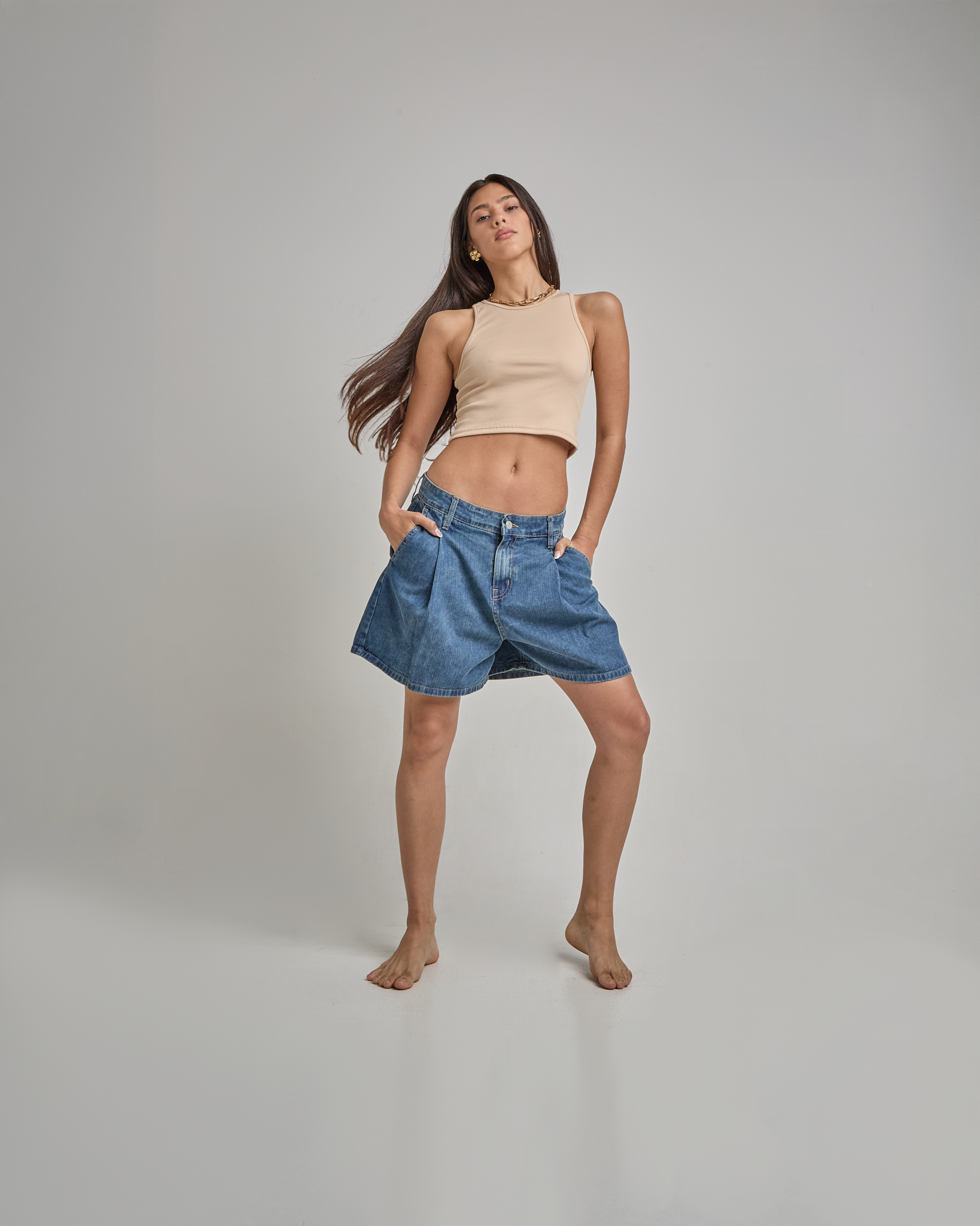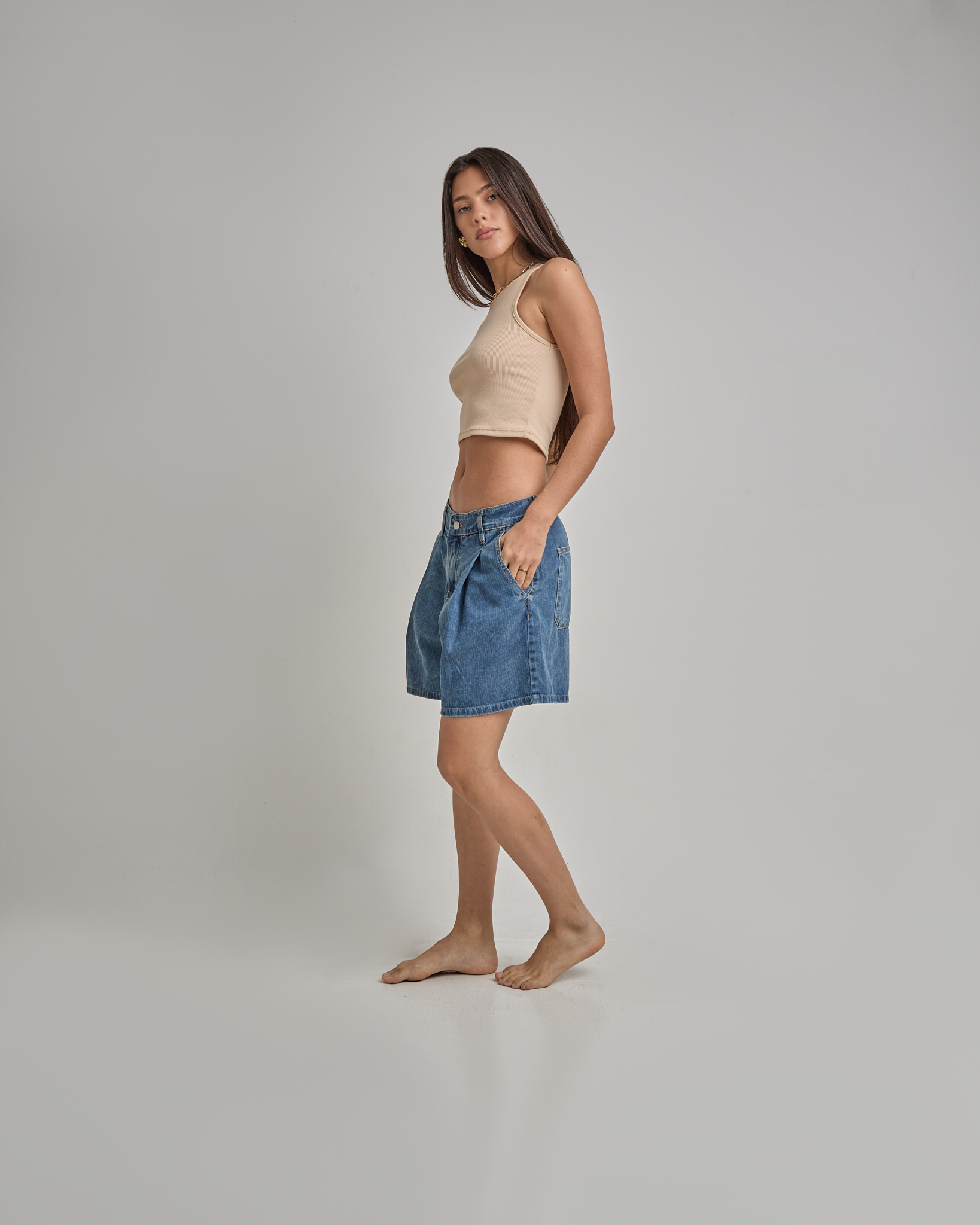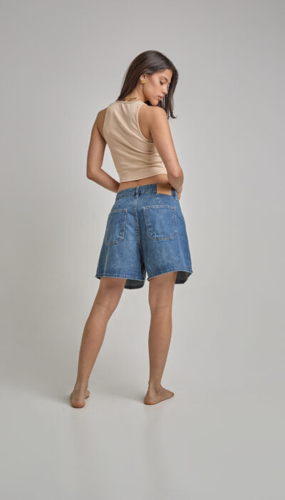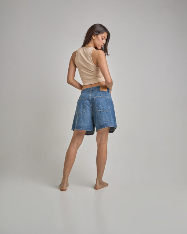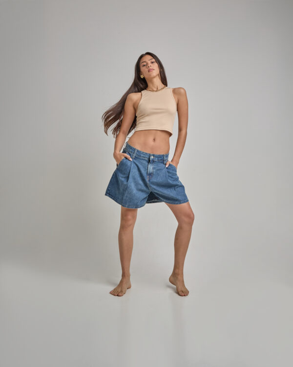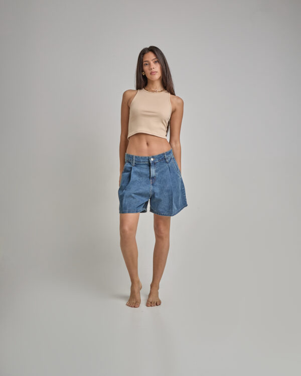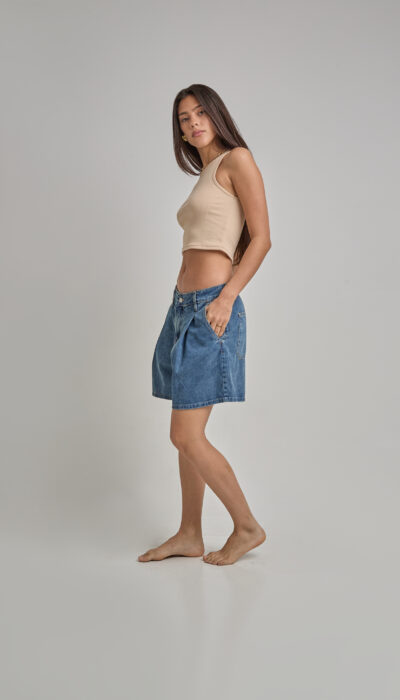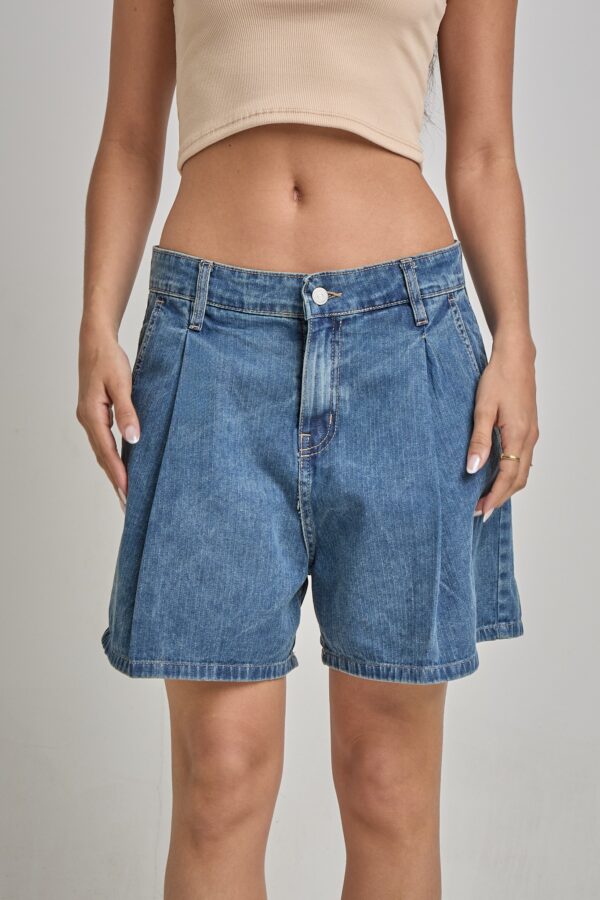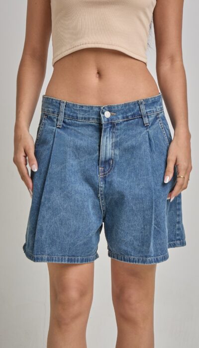 Short Jean Azul Rayado Con Pinzas Delanteras Y Traseras Rígido